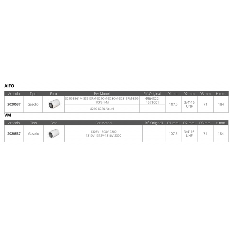 | 2020537 | FILTRO GASOLIO AIFO-LOMBARDINI | 184 MM | 107,5 MM | 3/4 - 16 UNF | 71 MM | 12,62 € | ● 18 pz. |
