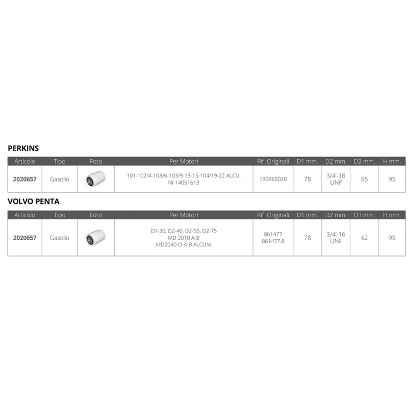 | 2020657 | FILTRO GASOLIO PERKINS VOLVO | 95 MM | 78 MM | 3/4 - 16 UNF | 62 MM | 12,49 € | ● 5 pz. |