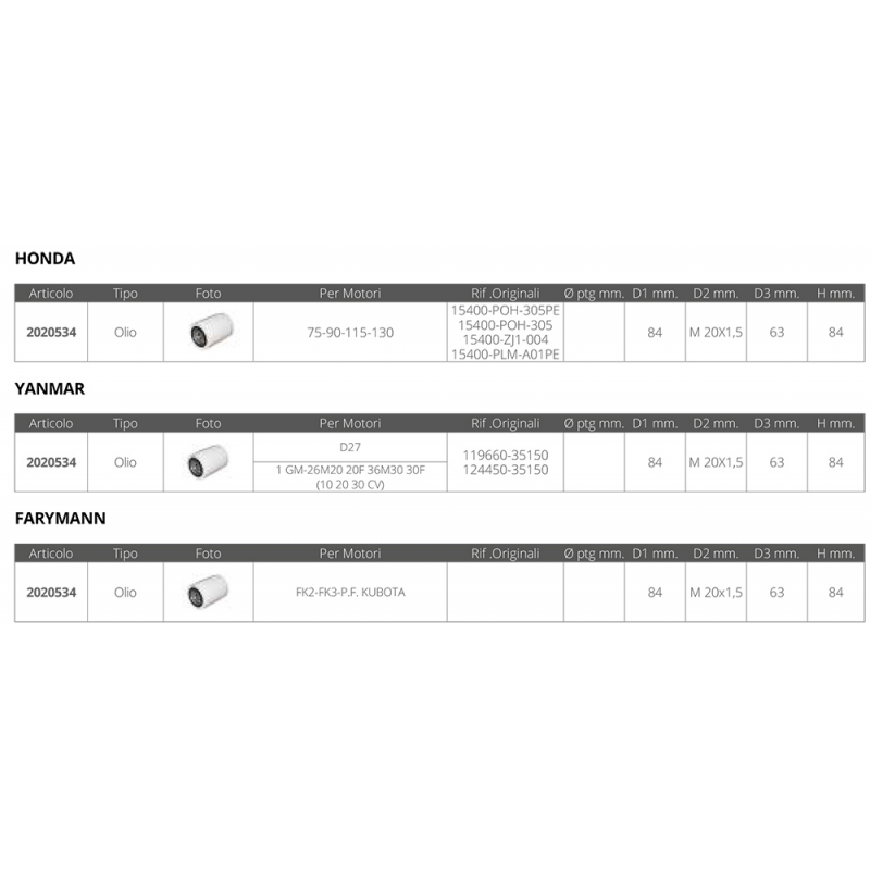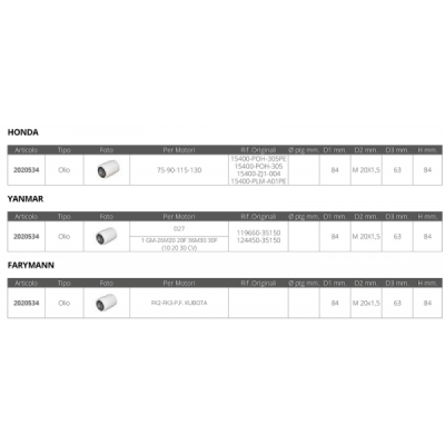 2020534 FILTRO OLIO HONDA YANMAR FARYMANN 84 MM 84 MM M 20X1,5 63 MM 12,25 € 9 pz.