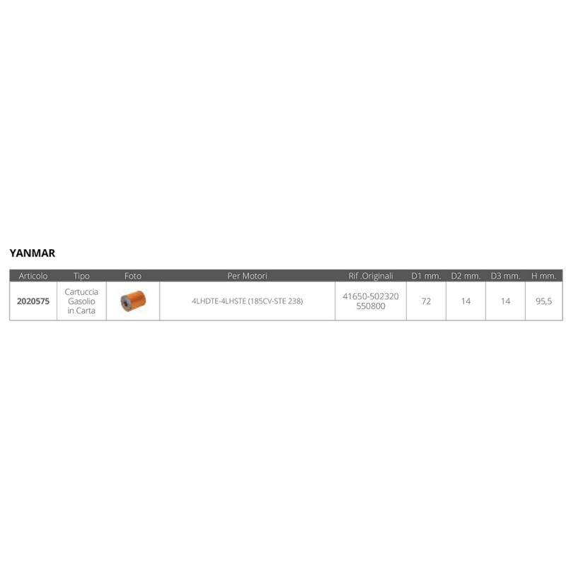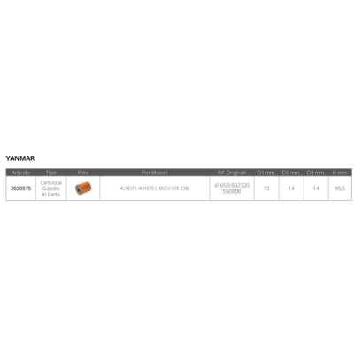| 2020575 | CARTUCCIA GASOLIO YANMAR | 95,5 MM | 72 MM | 83 MM | 14 MM | 14 MM | 15,58 € |