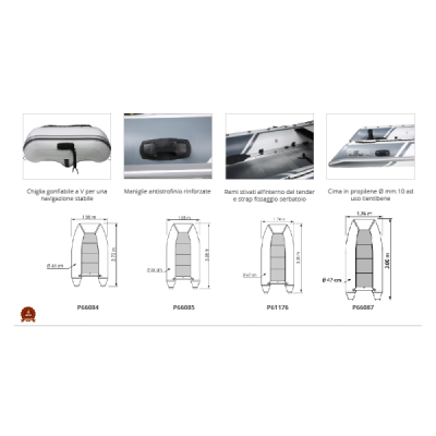 | P66086 | GRIGIO CHIARO/SCURO | TENDER PLASTIMO TRAIL P340 HA | 336X174X83 CM | P340HA | 59 KG | 5+1 BAMBINO | 750 KG | MAX 20 HP | IN ALLUMINIO | 47 CM | 3+1 | IN LEGNO CON ATTACCHI PER SEDILE | 2 ANELLI DI RIMORCHIO - 4 GOLFARI PER GRUETTE - 3 MANIGLIE TRASPORTO | 2.052,09 € | ● 5 pz. |